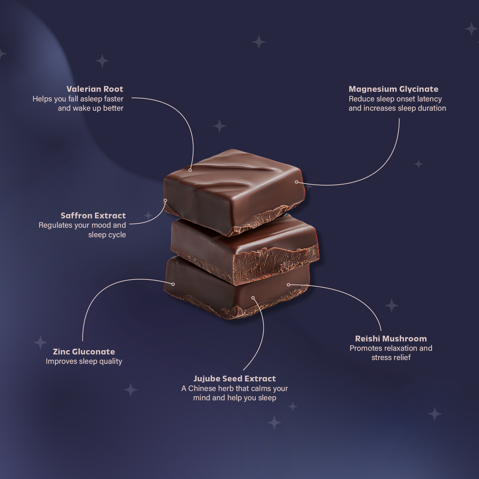 Eight science-backed botanicals for deeper sleep, calm nights, and clearer mornings — in one delicious chocolate.